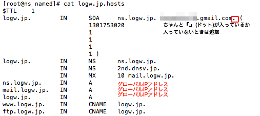 ↑ logwの正引きファイルです。グローバルIPアドレスというとこにIPを記載しています。参考サイトではFTPやwwwもグローバルIPアドレスが記述されていましたがそこを変えました。ドメインの終わりに必ず『.』がある事が重要です。実際にこのファイルはlogwで使っている物です。