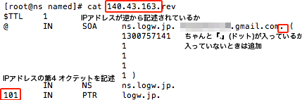 今度は逆引き設定です。逆引きファイルの名前をつける時、IPアドレスが逆から書いている必要があります。そして逆引き設定の名前をすると気に入れる数字はサーバーのグローバルIPアドレスの『第4オクテット』を記述する必要があります。この逆引きファイルもも実際にlogwで使用しています。