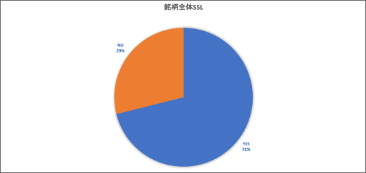 殆どの市場でSSLは5割超えで導入されています。自分が調べて驚いたのは、有名な企業(テレビで話題になったり新聞などで良く聞く企業)ならSSL対応しているのかな?と思ったら、実は対応していないとか、金融系ならSSLは入っているだろうと思ったら入っていないというのもありました。