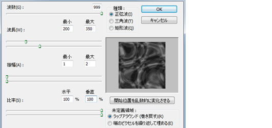 作成した画像にフィルタを適用させます。フィルタは『フィルタ→変形→波形』にします。数値は以下のようにします。