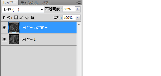 フィルタを適用したら、コピーしたレイヤーを選択して、ブレンドオプションを『比較(明)』にして、不透明度を『60%』にします。