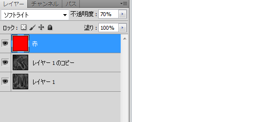 赤色のレイヤーを作成します。ブレンドモードを『ソフトライト』にして、不透明度を『70%』にします。