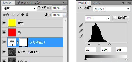 後はマスクを使い調整をします。このとき、『赤レイヤー』の下にマスクを作成します。サンプルではレベル補正をしてます。