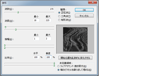 先ほどかけたレイヤー1に、もう一度フィルタをかけます。フィルタ→変形→波形を選択します。値は以下の様になります。