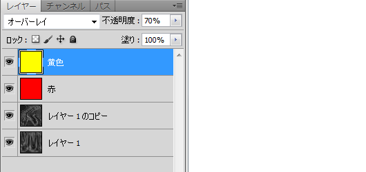 赤レイヤーの上に『黄色』のレイヤーを作成します。ブレンドモードは『オーバーレイ』にして、不透明度は『70%』にします。