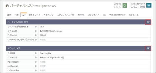 ログのタブにてバーチャルホストログとアクセスログを設定します