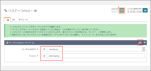 バーチャルホストの設定をします。ドメイン名などを入れたら2の保存を押します。保存をしたら3のWEBサーバーの再起動をします